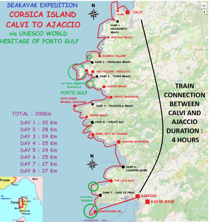 This expedition will make you discovering a big part of the wild west coast of Corsica. We will all meet on day 1 in Ajaccio, if you decide to fly to Corsica, we will pick up from Ajaccio Airport to transfer you on your arrival day in camping U prunelli**** where you can get a rest after your travels and energise for the upcoming sea kayaking expedition. Flights need to be booked in order to arrive in Ajaccio before 19.00p.m (on the arrival day) and leave before 12.00 (on the departure date).